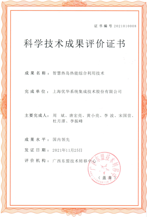 智慧熱島技術2021年入圍工信部國家工業節能技術推廣目錄。同年廣西科技廳廣西東盟技術轉移中心組織有關專家對“智慧熱島熱能綜合利用技術”科技成果進行了評價,評價結論為該技術達到了同類研究國內行業領先水平。